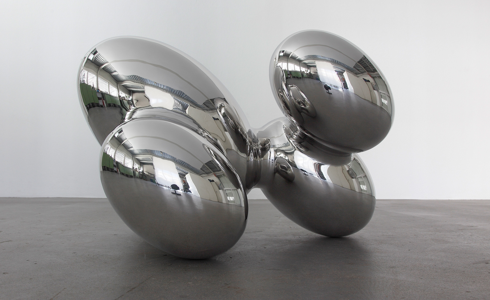 Die hochglanzpolierten Edelstahl Objekte widerspiegeln sich selbst, den Betrachter und den Raum, durch deren Form gekrümmt; auch hier eine Analogie zur Astronomie.