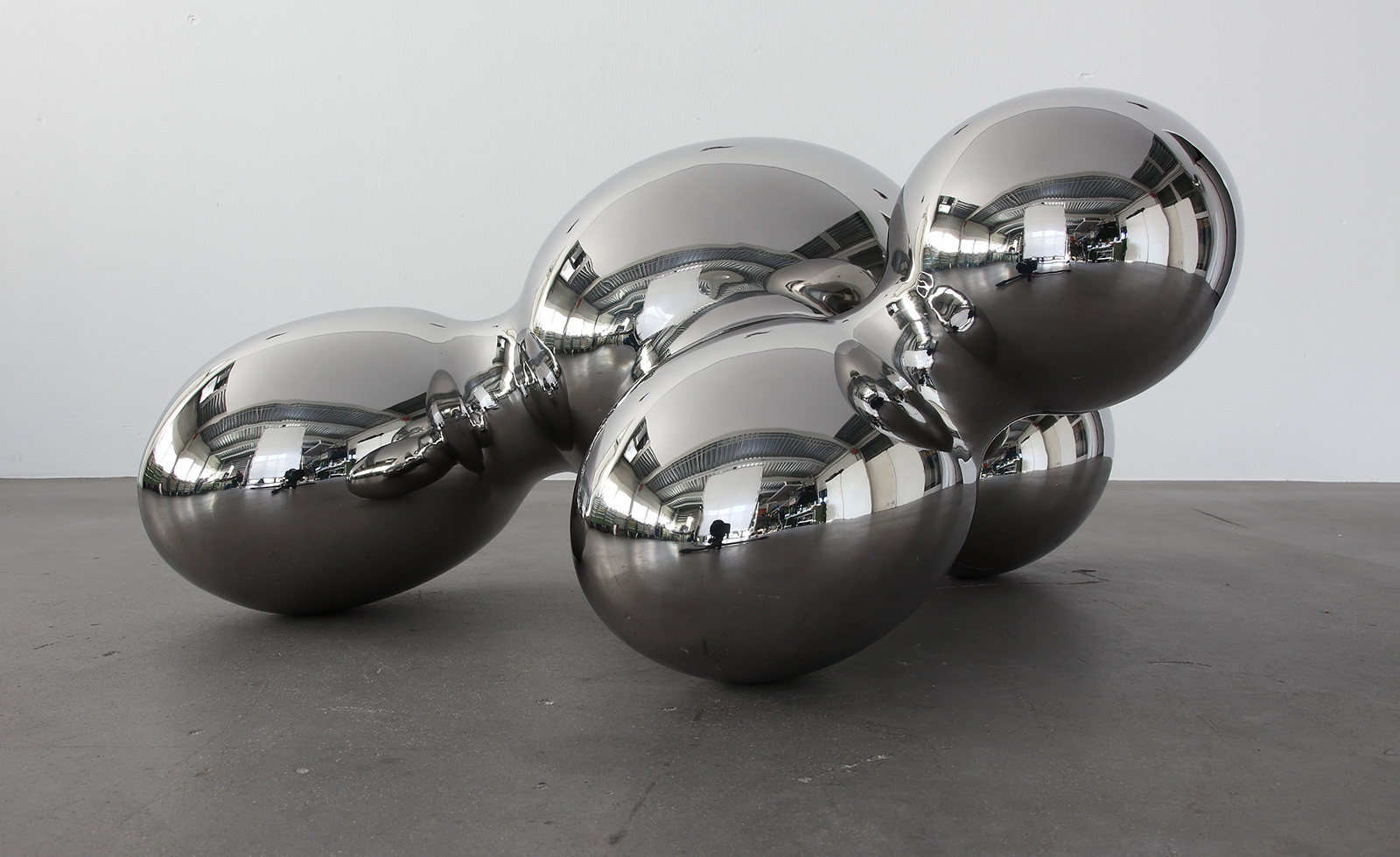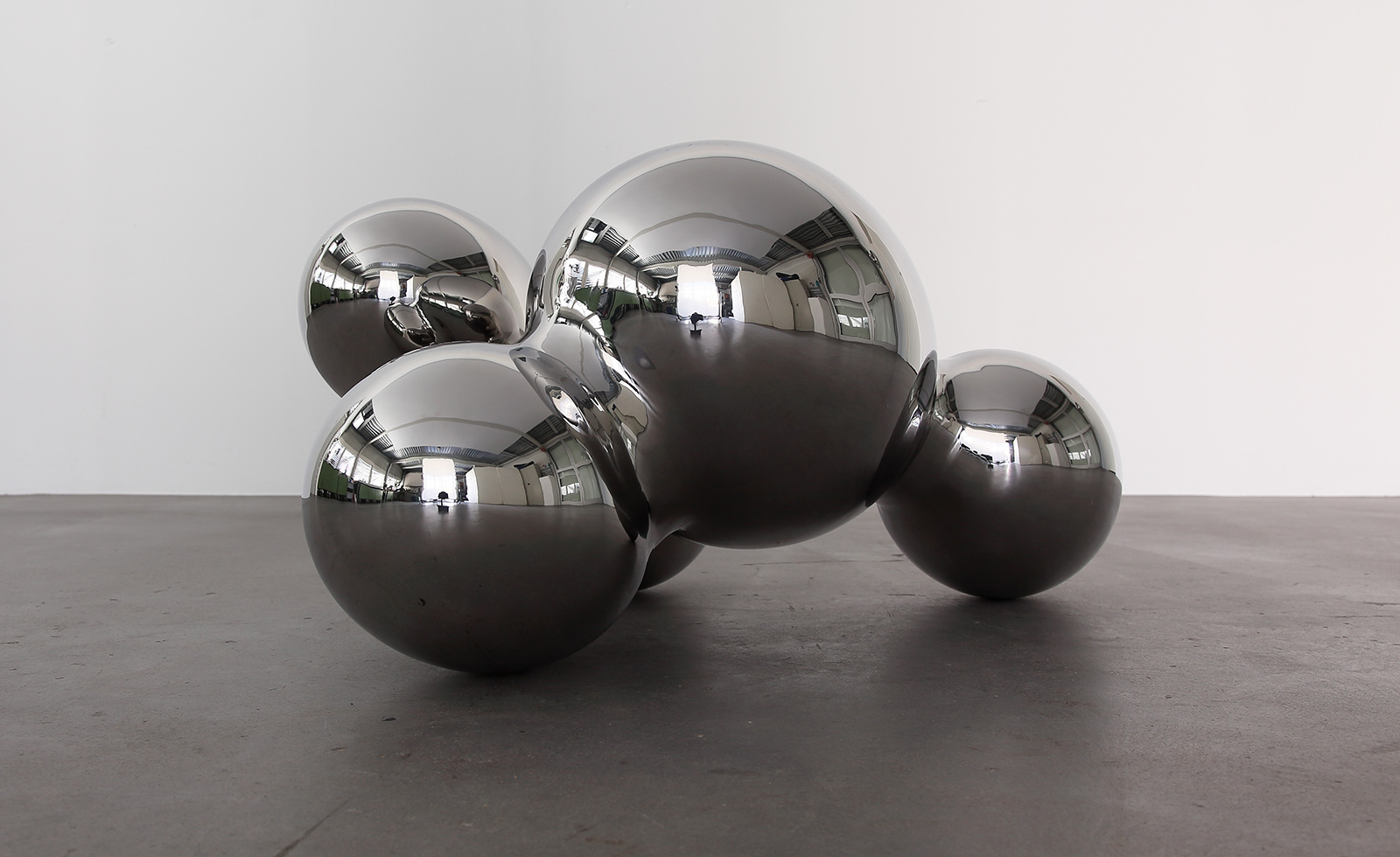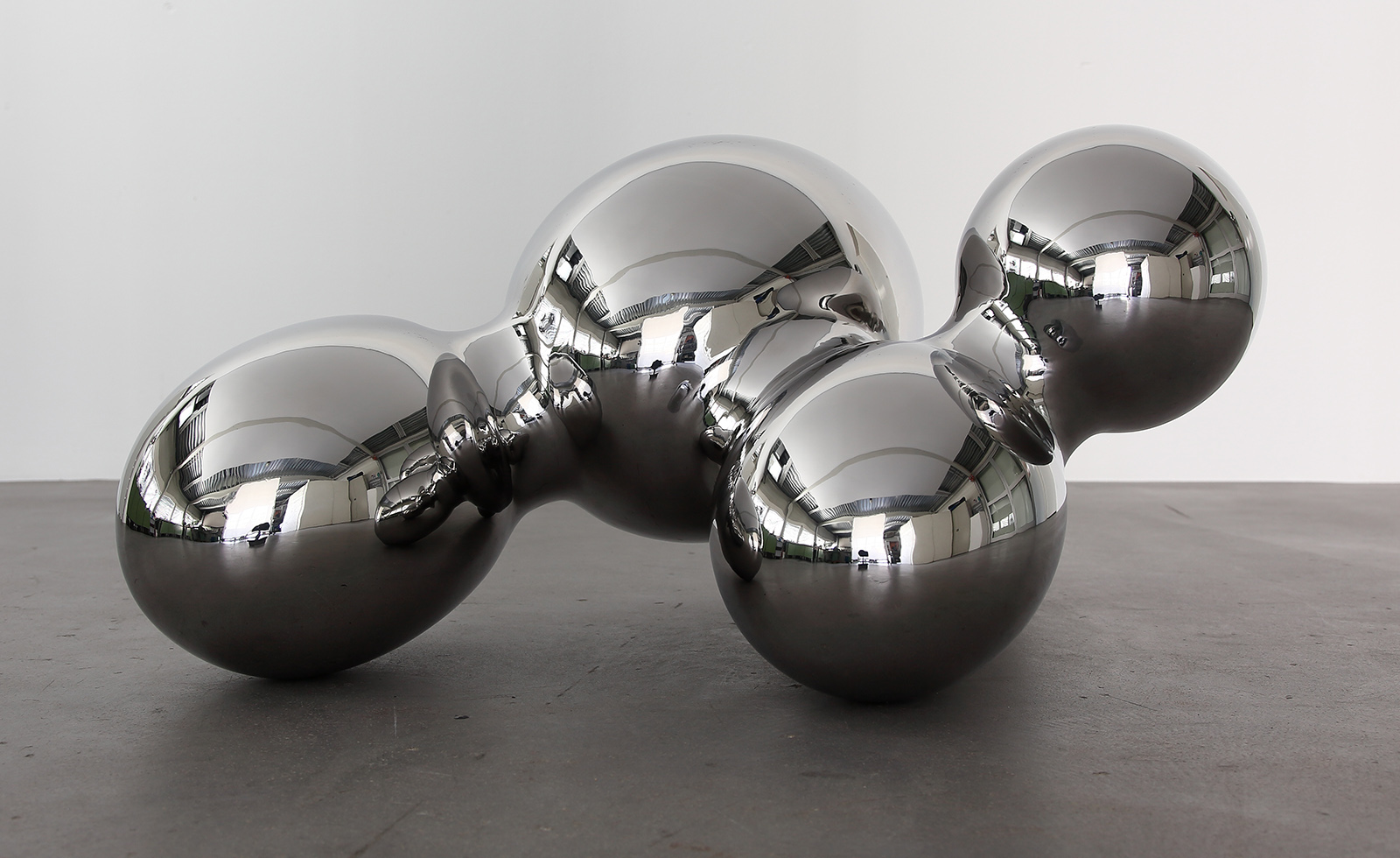 Die hochglanzpolierten Edelstahl Objekte widerspiegeln sich selbst, den Betrachter und den Raum, durch deren Form gekrümmt; auch hier eine Analogie zur Astronomie.
