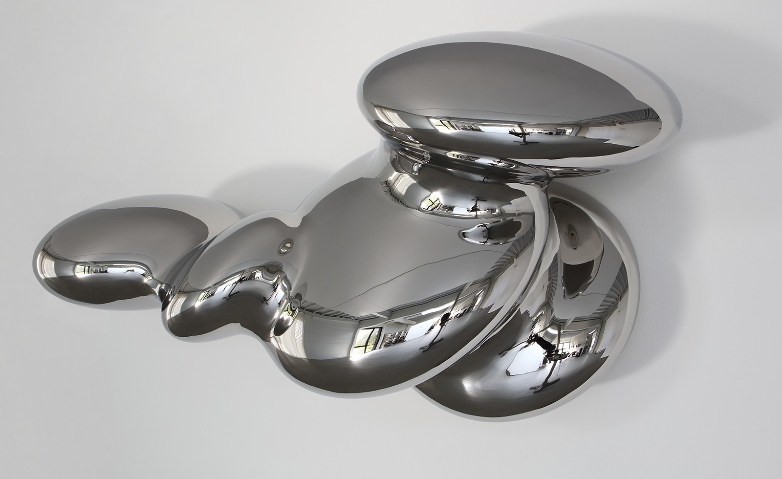 Die hochglanzpolierten Edelstahl Objekte widerspiegeln sich selbst, den Betrachter und den umgebenden Raum, durch deren Form gekrümmt. Auch hier eine Analogie zur Astronomie.
